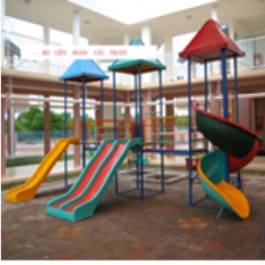 KT: (D450 x R350 x C350)cm Khung chân sắt ống 60 dày 2,5ly, khung sàn V4 dày 3ly, tay cầu thang, lan can 21 dày 1,1ly, sơn dầu nhiều màu. Mặt sàn , bậc thang, máng trượt, mái chòi bằng nhựa composite.
